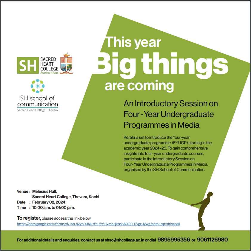 Kerala is set to introduce the ‘four-year undergraduate programme’ (FYUGP) starting in the academic year 2024-25. To gain comprehensive insights into four-year undergraduate courses, participate in the Introductory Session on Four-Year Undergraduate Programmes in Media, organised by the SH School of Communication.