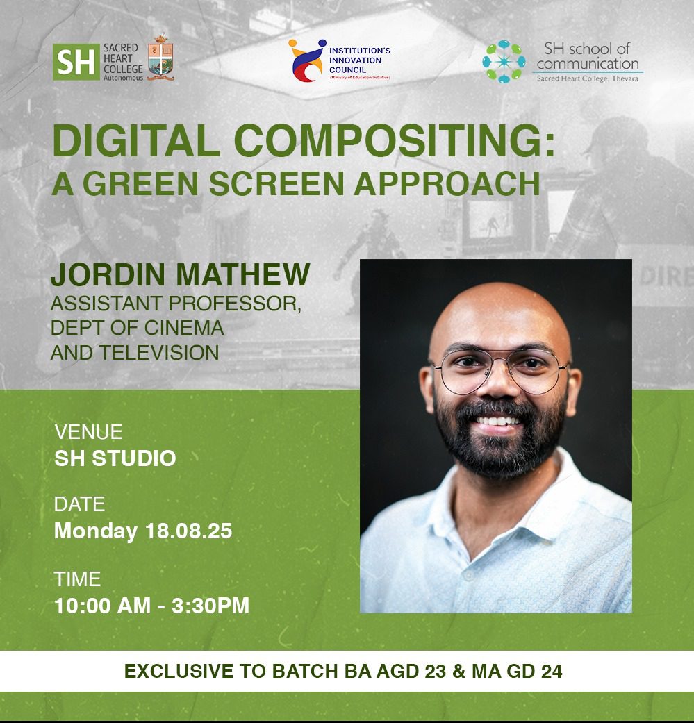 You are cordially invited to a specialized session on “Digital Compositing: A Green Screen Approach,” led by Jordin Mathew, Assistant Professor in the Dept of Cinema and Television. This essential workshop, which focuses on practical green screen techniques, is exclusive to the BA AGD 23 & MA GD 24 batches. The event will be held on Monday, August 18, 2025, from 10:00 AM to 3:30 PM at the SH Studio, hosted by the SH School of Communication, Sacred Heart College, Thevara. We look forward to your participation in this enriching experience!